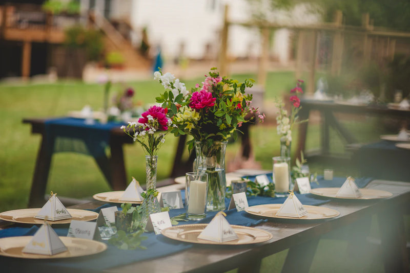 Combineer verschillende soorten bloemen en planten in gemengde vazen voor een informele uitstraling. Gebruik ook kleurrijke servetten om de look af te maken.